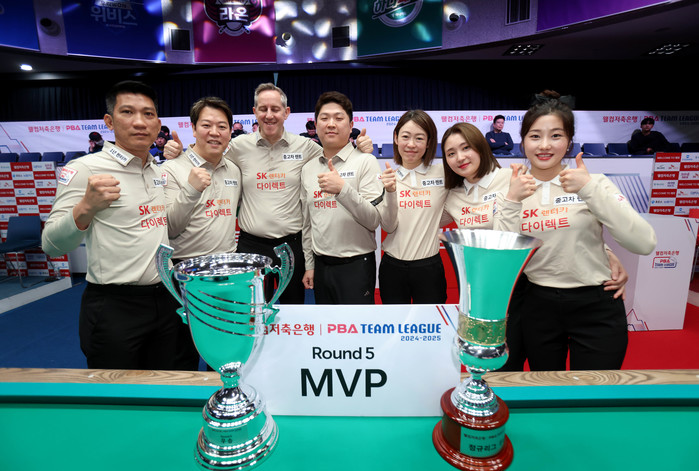 [Brilliant Billiards=김철호 기자] PBA 팀리그 SK렌터카가 창단 첫 정규리그 1위에 올랐다. 15일 경기도 고양시 ‘고양 킨텍스 PBA 스타디움’에서 열린 ‘웰컴저축은행 PBA 팀리그 2024-2025’ 5라운드 최종전서 SK렌터카는 크라운해태에 세트스코어 2:4로 패배했으나, 최종 성적 6승2패(승점17)를 기록하며 라운드 우승에 올랐다. 동시에 SK렌터카는 정규리그 종합 성적서 26승14패(승점74)를 기록하며 정규리그 1위를 확정했다. 5라운드 직전까지 20승12패(승점57)로 2위 하나카드(19승12패·승점56), 3위 NH농협카드(19승12패·승점55)의 거센 추격이 예상됐으나 이를 뿌리치고 선두를 지켰다.
