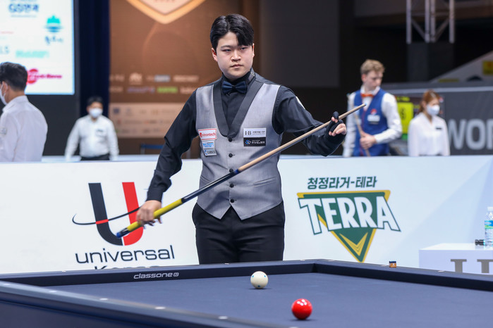 <원주=브릴리언트 빌이어드 김철호기자>신예 손준혁이 세계랭킹 9위인 에디먹스를 세트 스코어 2 대 0 으로 이기다
