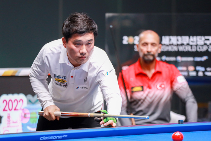[Brilliant Billiards=김철호 기자] 27일 서울 태릉 선수촌에서 열리고 있는 '2022 서울 세계 3쿠션 당구 월드컵' 8강에서 차명종이 세미 사이기너를 꺾고 4강에 진출했다.