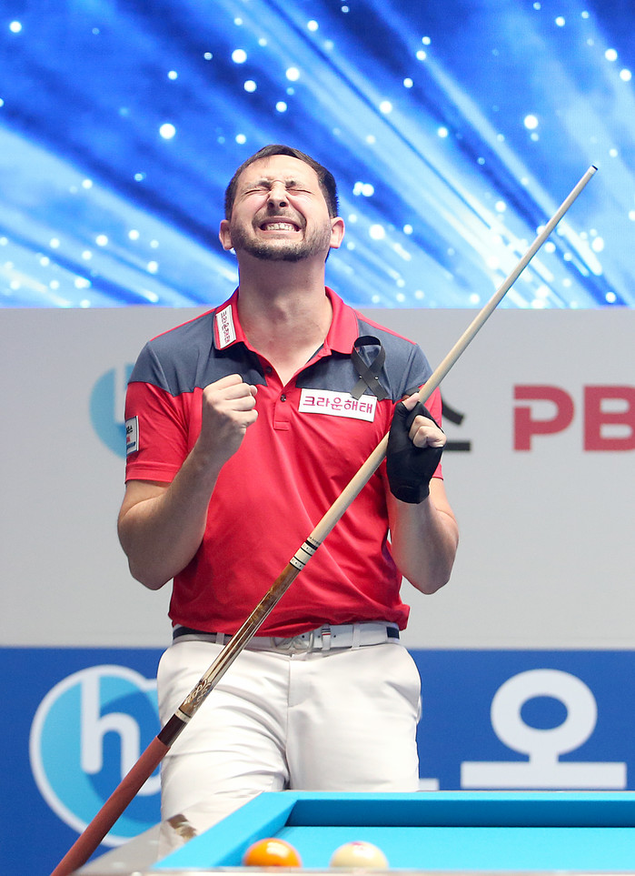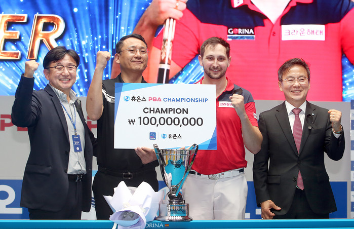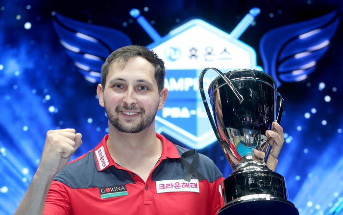 [Brilliant Billiards=서형석 기자] ‘스페인 강호’ 다비드 마르티네스(30·크라운해태)가 김영섭(47)의 돌풍을 잠재우고 프로당구(PBA) 통산 세 번째 우승컵을 들었다. 31일 경기도 고양시 빛마루방송센터에서 열린 ‘휴온스 PBA-LPBA 챔피언십’ PBA 결승서 마르티네스는 김영섭을 상대로 풀 세트 접전 끝에 4:3(14:15, 15:3, 13:15, 11:15, 15:5, 15:8, 11:7)으로 꺾고 정상에 올랐다.