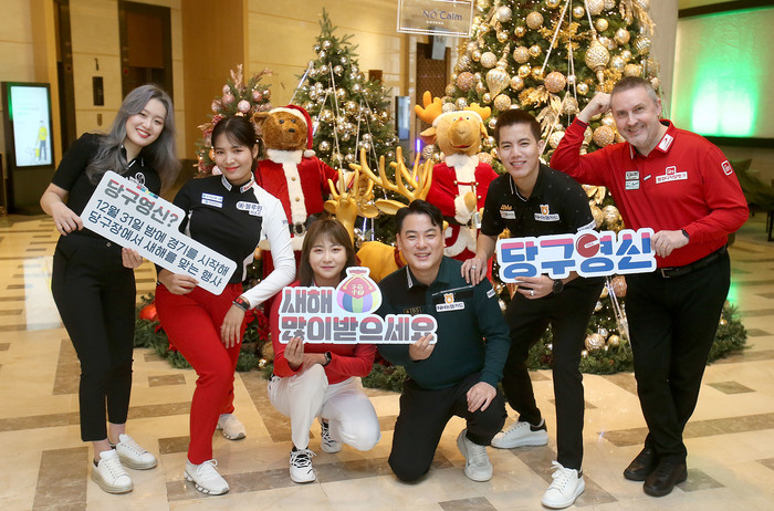 ▲ 팀리그 대표선수들이 연하장을 날리며 당구 영신을 홍보<PBA 사무국> |