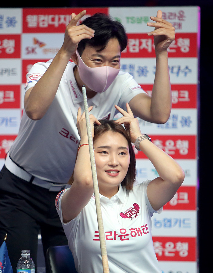 ▲ 크라운해태 강지은과 박한기가 승리의 세러머니를 펼치고 있다 |