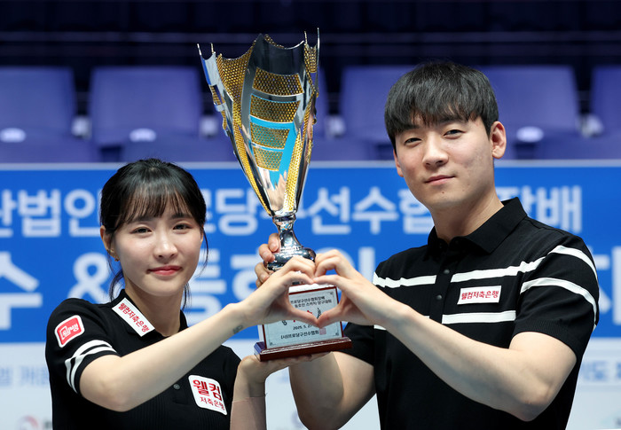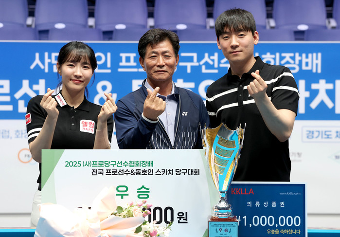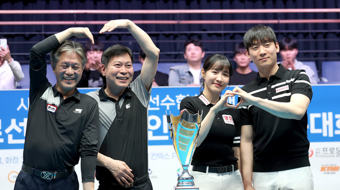 [Brilliant Billiards=유진모 기자] 최혜미(웰컴저축은행)와 남윤형이 프로선수와 동호인이 함께하는 스카치 당구대회서 우승을 차지했다. 27일 경기도 고양시 고양 킨텍스 PBA 스타디움에서 열린 ‘프로당구선수협회장배 전국 프로선수&동호인 스카치 당구대회’ 결승전서 최혜미(웰컴저축은행)-남윤형이 30:23(35이닝) 임태수-손부원을 꺾고 우승을 차지했다.