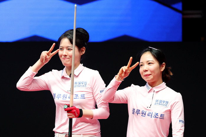 ▲블루원리조트 서한솔과 김민영이 여자 복식에서 김보미,김민아조를 상대로 승리하는 승리의 V자를 보이며 환호 |