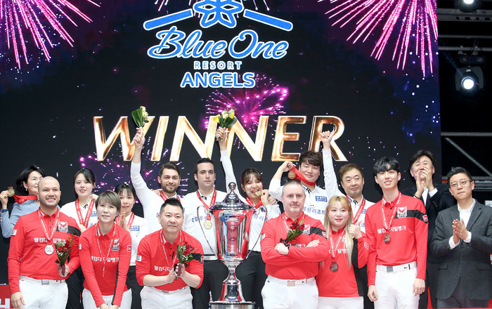 ▲팀리그 창단 3년만에 우승을 차지한 블루원리조트 선수들이 꽃가루가 날리는 경기장에서 우승트로피를 들고 환호하고 있다.<사진제공=pba 사무국> |