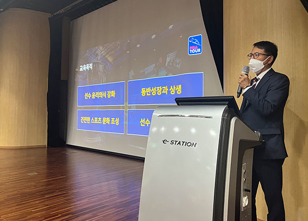 ▲PBA 김영진 사무총장이 강의를 맡아 선수들에게 소양교육을 시키고 있다 |