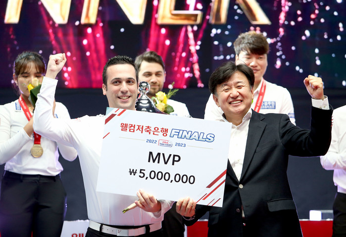 ▲ 월드참피언,투어참피언에 이어 팀리그 포스트시즌 MVP까지 엮어낸 사파타는 PBA 3관왕<사진제공=PBA 사무국> |