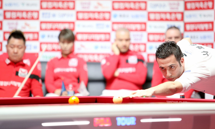 ▲팀리그 포스트시즌 5경기에서 목적구를 향해 조준하는 사파타<사진제공=PBA사무국> |