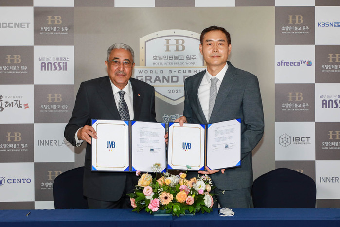 지난 18일 원주 인터불고 호텔에서 클라쏜 김대영 대표와 UMB 파룩 엘 바르키 회장이 만나 2022년 1월부터 2025월 12월까지 UMB 주최 공식 시합에서 클라쏜 당구대 천을 사용하는 것에 대한 계약을 맺었다.