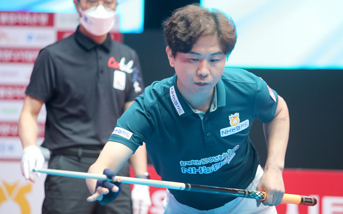 팀리그 3라운드 개막전에서 파머머리로 경기에 임하고 있는 NH 농협카드 김현우
