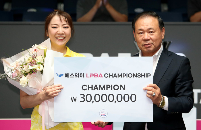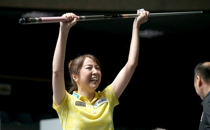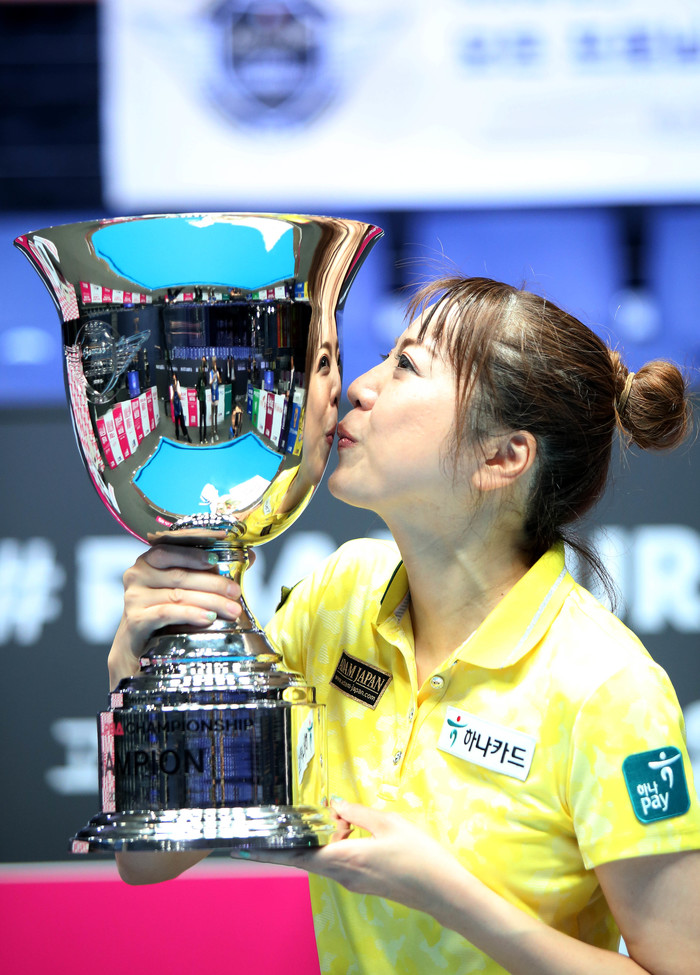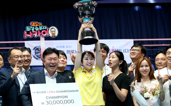 [Brilliant Billiards=서형석 기자] ‘일본 여자 3쿠션 강호’ 사카이 아야코(하나카드)가 프로 데뷔 4년만에 LPBA 13번째 챔피언에 올랐다. 4일 경기도 고양시 ‘고양 킨텍스 PBA 스타디움’에서 열린 ‘에스와이 LPBA 챔피언십’ 결승전서 김민아(NH농협카드)를 상대로 세트스코어 4:2(8:11, 11:10, 4:11, 11:0, 11:8, 11:6)로 승리를 거두고 상금 3000만원과 프로 첫 우승컵을 들었다.