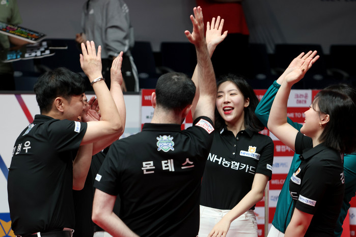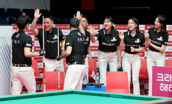NH농협카드가 3연승을 달리며 선두(SK렌터카)를 바짝 추격했다. 28일 경기도 고양시 ‘고양 킨텍스 PBA 스타디움’에서 열린 ‘웰컴저축은행 PBA 팀리그 2024-25’ 2라운드 4일차서 NH농협카드는 웰컴저축은행을 상대로 초반 두 세트를 내주고도 내리 4세트를 따내며 세트스코어 4:2로 승리했다.