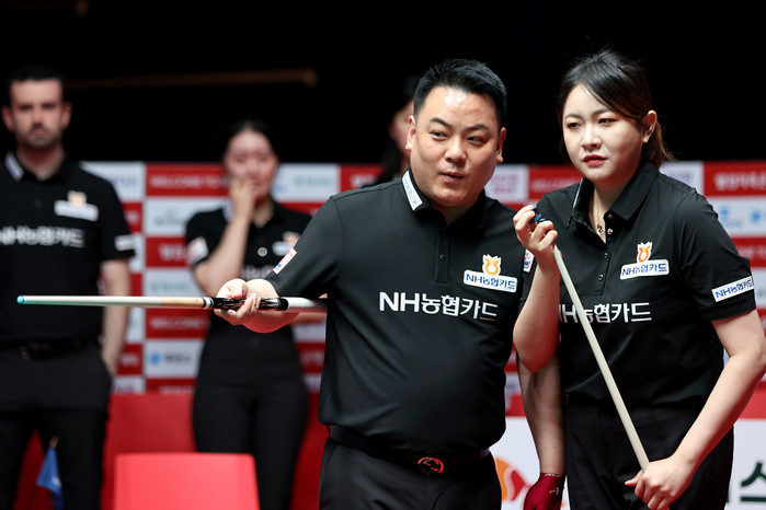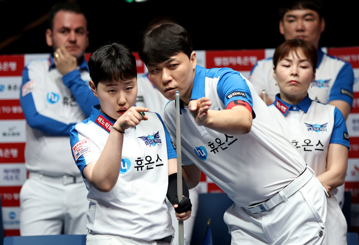 [Brilliant Billiards=신종삼 기자] 프로당구 PBA 팀리그 휴온스가 김세연의 2승을 앞세워 시즌 첫 승리를 신고했다. 18일 경기도 고양시 ‘고양 킨텍스 PBA 스타디움’에서 열린 ‘웰컴저축은행 PBA 팀리그 2024-2025’ 1라운드 4일차서 휴온스는 우리금융캐피탈을 상대로 세트스코어 4:2로 승리를 거두었다. 전날 첫 승을 올린 우리금융캐피탈을 상대로 휴온스의 초반 기세가 좋았다. 최성원과 이상대가 첫 세트서 다비드 사파타(스페인)-엄상필을 상대로 4이닝만에 11점을 합작해 11:4로 승리했다. 곧바로 김세연과 이신영도 스롱 피아비(캄보디아)-서한솔을 9:1(7이닝)로 제압하면서 세트스코어 격차를 2:0으로 벌렸고, 3세트에 나선 하비에르 팔라손(스페인)도 잔 차파크(튀르키예)를 15:8(8이닝)로 물리치며 승기를 잡았다.