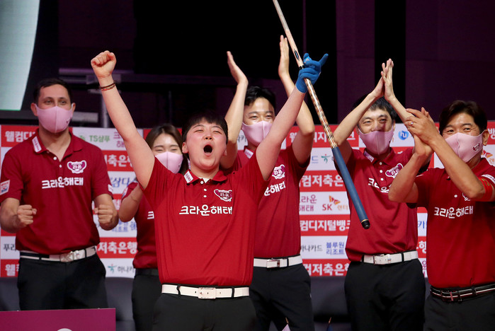 [Brilliant Billiards=김철호 기자] 19일 강원도 춘천시 엘리시안강촌에서 열린 ‘웰컴저축은행 PBA 팀리그 2022-23’ 2라운드 4일차 경기서 크라운해태는 1세트와 3세트서 2승을 챙긴 ‘팀 리더’ 김재근의 활약으로 웰컴저축은행을 세트스코어 4:2로 꺾고 2라운드 4연승과 함게 무패행진을 이어가고 있다. TS샴푸·푸라닭와 NH농협카드도 나란히 SK렌터카와 휴온스를 제압하고 승수를 추가했다. 반면, 사파타의 ‘11점 퍼펙트큐’ 달성에도 불구하고 승리를 눈 앞에 둔 블루원리조트는 하나카드에 세트스코어 3:4로 역전패를 당했다.