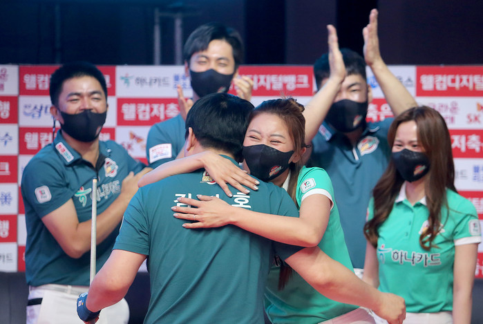 ▲ 7이닝 풀세트 접전끝에 아슬아슬한 승리를 낚으며 팀을 구한 하나카드 팀리더 김병호가 승리한후 김가영의 포옹 축하를 받고 있다 |