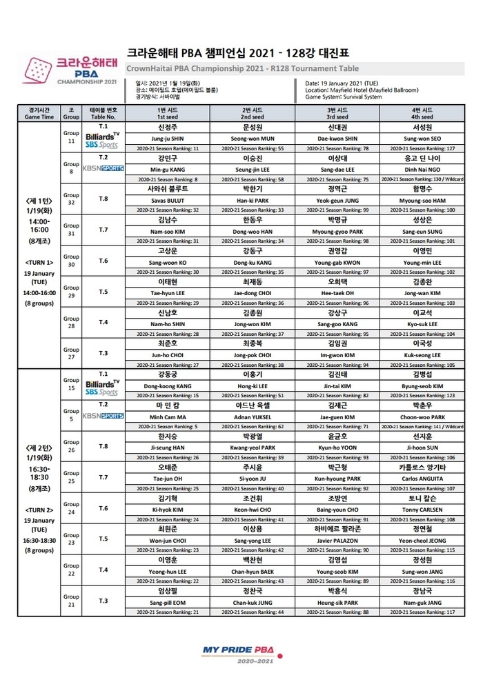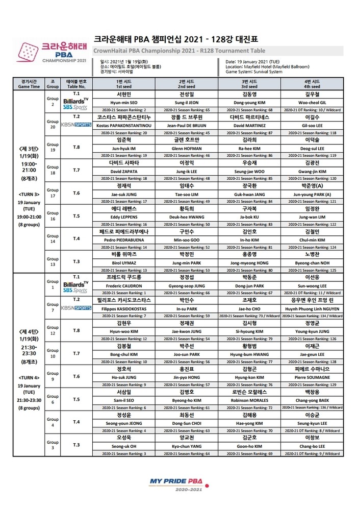 [브릴리언트 빌리아드=김철호 기자] 19일부터 23일까지 강서구 메이필드호텔에서 특설경기장에서 벌어지는 2021년 크라운해태 PBA 참피온십 첫날128강 경기(19일 21;30~23;00)에서는 그룹 7 초대 참피온 카시도 코스타스와 크라운해태의 박인수 ,3차투어에서 64강에 그친 한국당구의 자존심 조재호, 베트남 특급 프엉린이 맞붙게 되어 볼거리를 제공하게 된다. 4명중 상위 두명만이 64강에 진출하는 서바이벌경기에서 누가 1,2위를 차지할지 귀추가 주목되는 상황이 연출될 것이다. 또한 그룹 6에서(19일 21;30~23;00)지난대회 준우승의 서삼일,TS.DJX의 맏형 김병호,TS.DJX의 모랄레스,백창용이 맞붙게 되어 누구도 1,2를 장담할 수 없게 되었다.