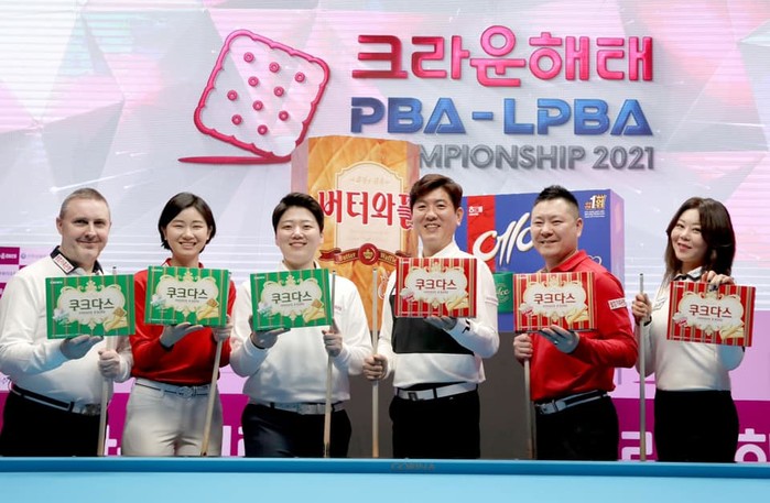 ▲ 지난대회 우승자 서현민과 이미래프로 크라운해태 김재근주장과 백민주 프로 ,신한은행주장 김가영프로, 웰뱅피닉스의 쿠드롱이 한자리에 모여 포즈를 취했다(사진= PBA 제공) |