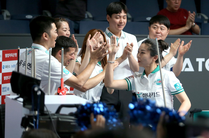 [Brilliant Billiards=서형석 기자] 프로당구 PBA 팀리그의 하나카드 하나페이가 ‘디펜딩챔피언’ 블루원리조트를 꺾고 단독 1위로 올라섰다. 6일 경기도 고양시 ‘고양 킨텍스 PBA 스타디움’에서 열린 ‘웰컴저축은행 PBA 팀리그 2023-2024’ 1라운드 4일차 경기서 하나카드는 신정주, 김가영 등 출전 선수 전원이 승리를 합작하는 활약으로 블루원리조트를 세트스코어 4:2로 제압하고 승점3을 더해 단독 선두(승점8)로 점프했다.