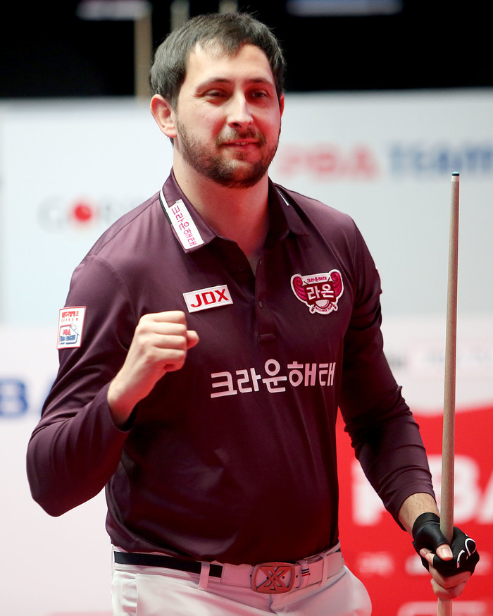[Brilliant Billiards=서형석 기자] 크라운해태가 다비드 마르티네스(스페인)의 맹활약을 앞세워 휴온스를 세트스코어 4:2로 꺾고 6라운드 첫 경기를 승리로 장식했다. 마르티네스는 첫 세트부터 선지훈과 호흡을 맞춰 하비에르 팔라존(스페인)-김기혁을 15:10(12이닝)으로 제압한 데 이어 2:2 팽팽하던 5세트에서도 글렌 호프만(네덜란드)를 15:13(9이닝)으로 제압하며 팀 승리를 견인했다.