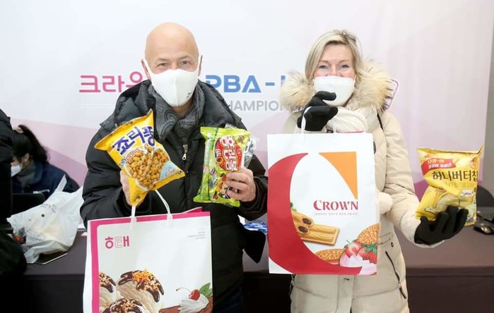 ▲장폴 드 브루윈선수 부부가 선물로 받은 과자를 들어보이고 있다<사진제공=PBA> |