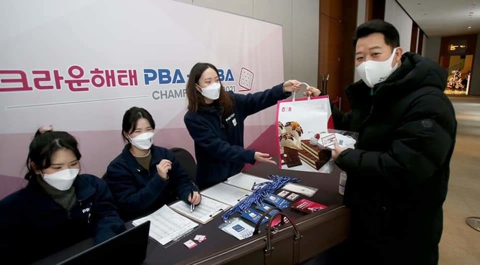▲입구에서 과자선물 꾸러미를 받고 있는 강동궁선수<사진제공=PBA> |