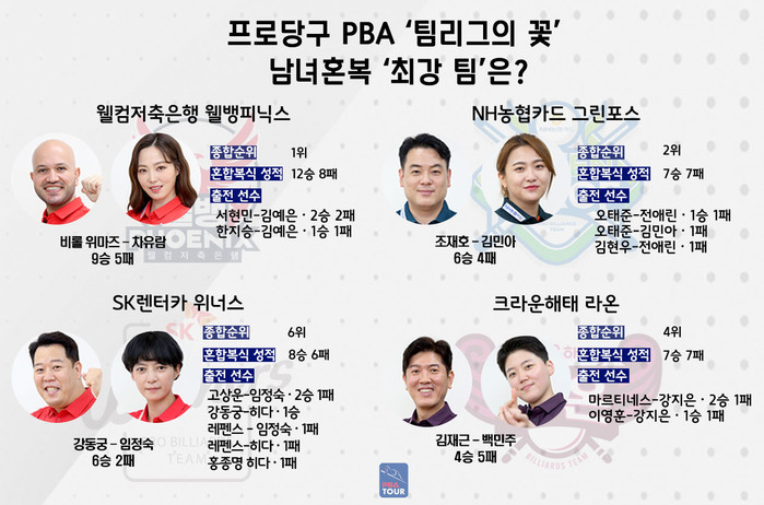 웰컴저축은행-NH농협카드 “최강복식 보유, 리그 선두권 원동력”PBA 팀리그 ‘최강 혼복’ 웰컴저축은행의 비롤 위마즈(터키)-차유람이 6승 2패로 맹활약 중이다. 이에 힘입어 팀도 전체 1위로 2라운드를 마감하면서 전기리그 우승에 가장 앞서 있다. 지난 시즌부터 꾸준히 호흡을 맞췄기에 별다른 실험이 필요 없었던 웰컴저축은행은 1세트 쿠드롱, 4세트 위마즈-차유람, 6세트 한지승을 중심으로 선발 라인업을 구성하며 안정된 경기운영을 선보이고 있다. 혼합복식 최다승을 거둔 ‘위-차’ 조합 뿐만 아니라 차유람의 뒤를 받치는 김예은도 서현민, 한지승과 6경기에 나서 3승 3패로 나쁘지 않은 성적을 거두었다.