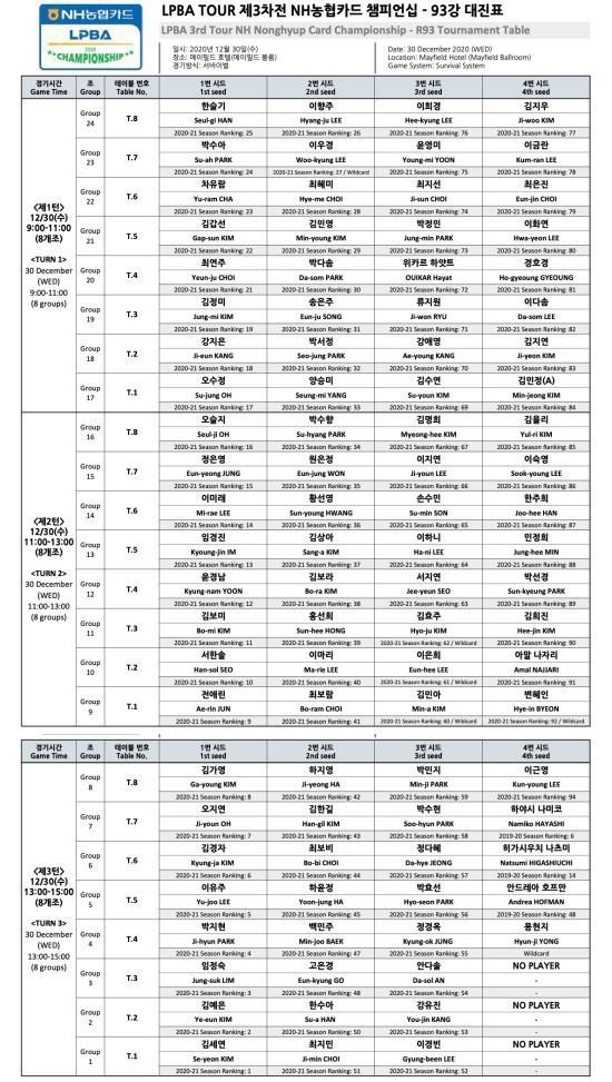 30일 예선전에 들어가는 LPBA는 NH농협카드에서 한 팀을 이룬 김민아와 전애린이 경쟁자로 만난다. 아마추어 여자 3쿠션 1인자 김민아와 2020-21시즌 LPBA 개막전에서 공동 3위에 오른 전애린이 펼칠 선의의 대결이 관심을 모은다.