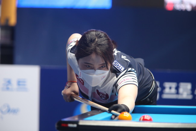 [브릴리언트 빌리아드=김철호 기자] 2020 신한금융투자 PBA TEAM LEAGUE 첫날 두 번째 경기 크라운해태 VS 블루원리조트의 경기에서 크라운해태 라온의 강지은선수가 샷을 노리고 있다