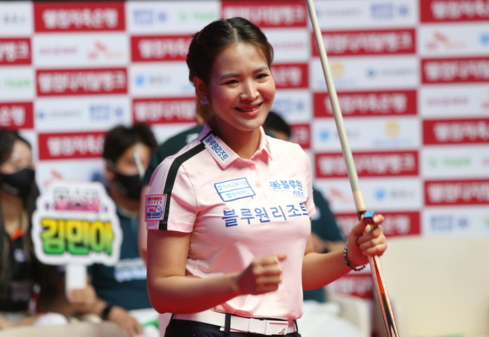 [Brilliant Billiards=김철호 기자] 19일 경기도 고양 빛마루방송센터에서 열린 ‘웰컴저축은행 PBA팀리그 2021-22’ 2라운드 6일차 경기, 2위를 달리고 있는 신생팀 NH농협카드엑 유일한 1패를 안긴 블루원리조트와 NH농협카드의 경기 여자단식에서 블루원리조트 스롱피아비가 김민아를 상대로 이닝 11대5로 승리하여 동점을 만들고 환호하고 있다