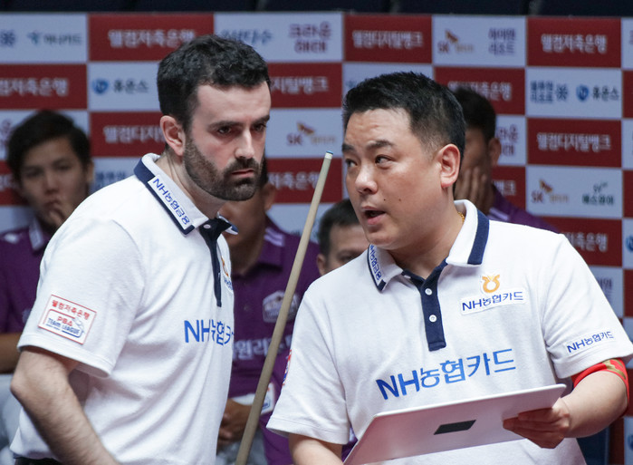 지난 1,2라운드서 휴온스에 유독 약한 모습을 보이며 2패했던 NH농협카드는 이날 승리로 지난 패배를 설욕함과 동시에 3라운드 4연승을 달성하며 단독 1위(승점11)로 기세를 이어갔다. NH농협카드는 조재호와 오성욱이 첫 세트서 세미 사이그너(튀르키예)-김봉철에 9:11(6이닝) 패배하며 불안하게 출발했으나 2세트서 김민아-김보미가 전애린-장가연을 9:8(13이닝) 1점차 승리를 따내며 맞불을 놨다. 특히 김민아와 김보미는 이날 승리로 여자복식 9연승을 달성, ‘최강 여복’의 위용을 뽐냈다.