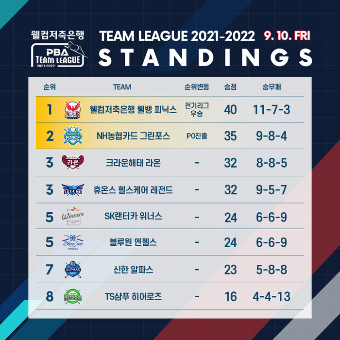 ‘웰컴저축은행 PBA 팀리그 21-22’ 3라운드 경기 결과, 선두 웰컴저축은행(11승7무3패)이 승점 40점으로 전반기 우승을 수상, NH농협카드가 9승8무4패(승점35점)로 준우승을 차지했다. 이어 휴온스(9승5무7패·승점32점), 크라운해태(8승8무5패·승점32점)가 공동 3위, SK렌터카(6승6무9패·승점24점)와 블루원리조트(6승6무9패·승점24점)가 공동 5위에 올랐다. 이어 신한금융투자(5승8무8패·승점23점) 7위, TS샴푸(4승4무13패·승점16점)이 8위를 달렸다.