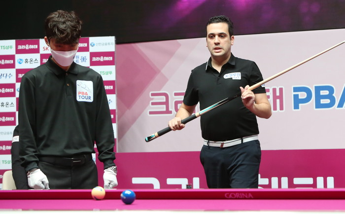 [Brilliant Billiards=김철호 기자] 14일 오후 고양 빛마루 방송센터에서 열린 “크라운해태 PBA-LPBA참피언십 21-22” PBA 준결승전. 챔피언 2승에 빛나는 사파타(블루원리조트)와 김영섭의 경기에서 사파타는 1세트 뱅크샷5개 2세트 뱅크샷 4개로 1,2세트를 가볍게 따내며 세트스코어 2대0으로 앞서나갔다.