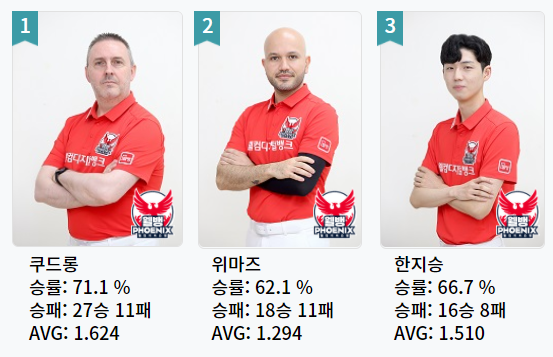 쿠드롱은 같은 팀원인 비롤 위마즈(터키·18승11패) 한지승(16승8패), 준우승 팀 NH농협카드의 조재호(22승16패), 오태준(22승15패) 등의 MVP 후보와 경쟁했다.