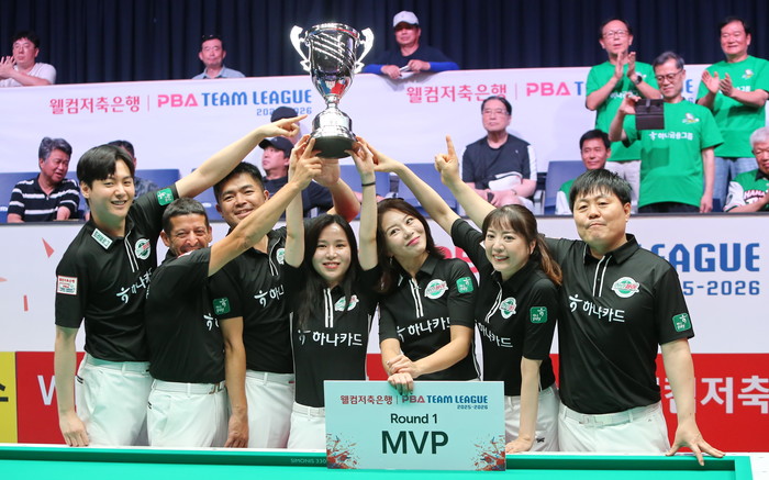 [Brilliant Billiards=김철호 기자] 25-26 PBA 팀리그 1라운드 마지막날 승점 17점으로 단독 1위를 달리고 있는 하나카드 하나페이와 1라운드 1승7패 승점 4점으로 최하위를 지키고 있는 휴온스 헬스케어 레전드와의 경기에서 하나카드 하나페이가 휴온스를 상대로 4대2로(11-10,5-9,13-15,9-7,11-5,9-7) 승리하며 승점 20점을 기록하며 25-26 팀리그 1라운드 우승을 차지했다. 1라운드 MVP는 하나카드 김가영 선수가 차지 했다.
