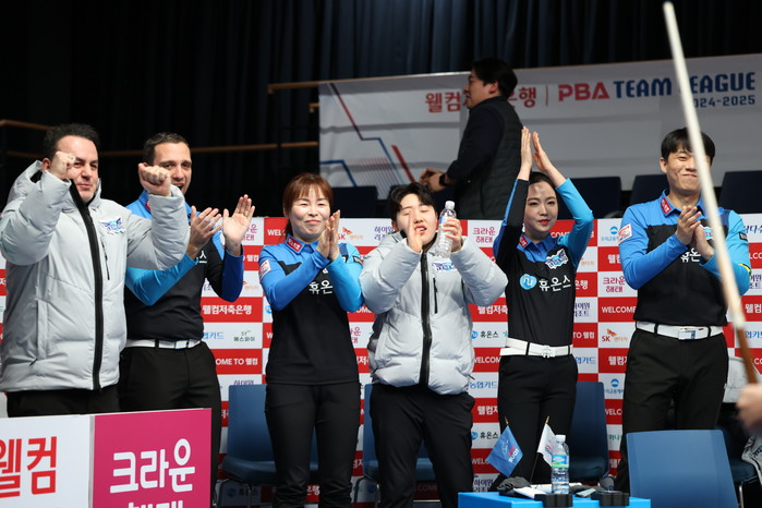이밖에 이날 열린 다른 경기서는 휴온스가 하이원리조트를 세트스코어 4:1로 제압하며 2연승, 5라운드 선두를 차지했다. 첫 세트에 나선 최성원-이상대가 퍼펙트큐를 기록하는 등 최성원 이신영이 나란히 2승을 올려 팀 승리를 견인했다. 또 우리금융캐피탈이 강민구의 2승을 앞세워 에스와이에 4:2 승리했고, 5라운드 첫 경기를 가진 크라운해태가 팀원들의 고른 활약을 앞세워 웰컴저축은행을 4:1로 꺾었다.