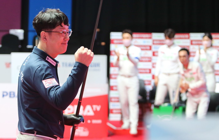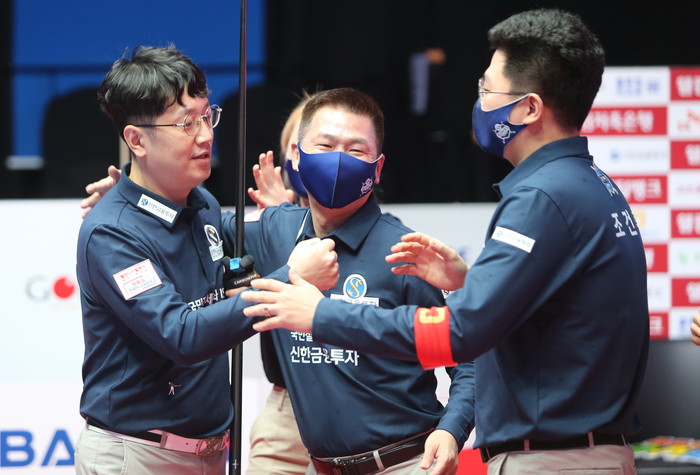 ▲신한알파스의 믿을맨 오성욱이 승리하며 1승 얻고 동료들의 축하를 받고 있다[Brilliant Billiards=김철호 기자]