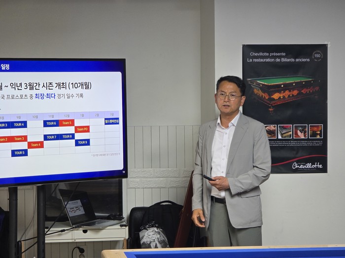 이날 PBA에서는 한양대학교 스포츠산업과학부 학생들을 만나 크게 두 가지 파트로 나눠 학생들과 교감을 나눴다. 먼저 PBA 김영진 전무이사가 연사로 나서 학생들을 상대로 강연에 나섰다. 김영진 전무이사가 PBA의 지난 6년간 출범부터 현황까지 발전 과정을 소개했다. 학생들은 필기를 하고, 녹음까지 하는 등 강연에 열정적인 모습을 보였다.