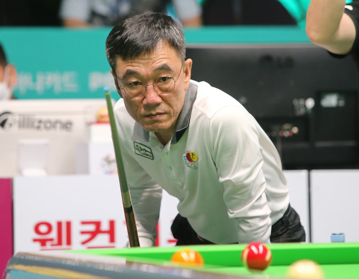 ▲32강전에서 김병섭이 응고딘나이와의 경기에서 목적구를 향해 오는 볼을 지켜보고 있다 |