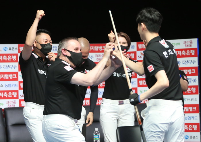 ▲풀세트 10대10에서 한큐로 귀중한 1승을 따낸 웰컴저축은행 한지승을 동료들이 맞이하고 있다 |