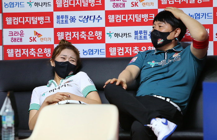 ▲"피말리네" 혼합복식의 김진아와 응우옌이 아슬아슬하게 승리를 이끌자 벤치에서 한숨을 쉬는 김가영과 김병호
