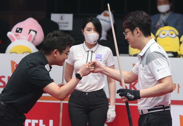 ▲ 남자 8강전부터 선수들은 마스크에서 해방되어 경기를 치루고 있다. 8강전 세번째 오성욱선수와 오태준선수가 경기전 주먹 악수를 나누고 있다 |