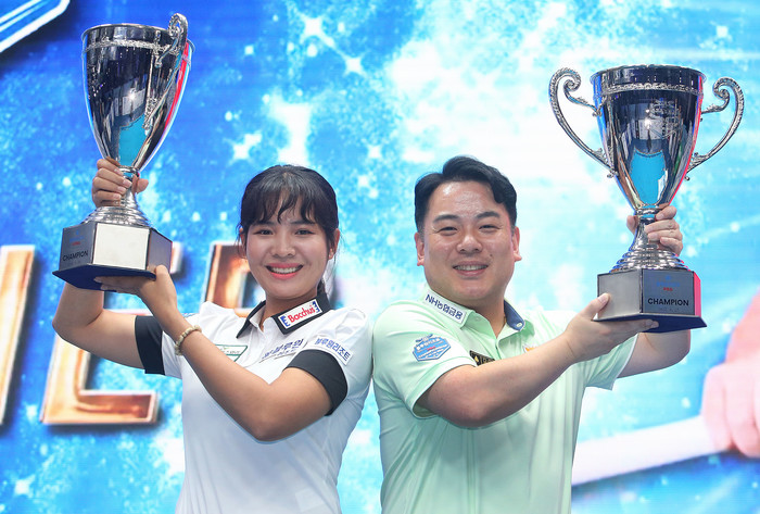 ▲LPBA 우승 스롱 피아비<블루원리조트>와 PBA 우승 조재호<NH농협카드>가 나란히 트로피를 들고 포즈릉 취하고 잇다 |