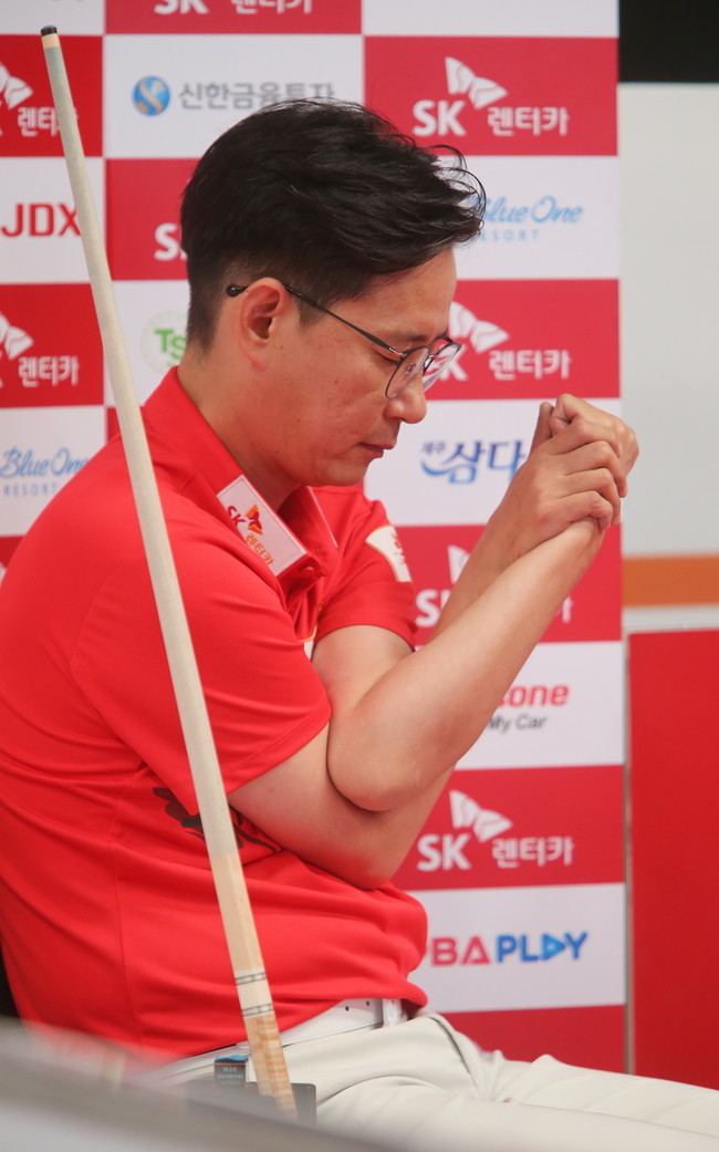 [브릴리언트 빌리아드=김철호 기자] 2020년 PBA 프로당구 1차투어가 열리고 있는 서울 광진구 워커힐 호텔에서 열린 대회 마지막날 남자부 결승전. 오성욱 선수와 정성윤 선수의 경기에서 정성윤 선수가 경기 중간중간 스트레칭을 하며 몸을 가다듬고 있다.