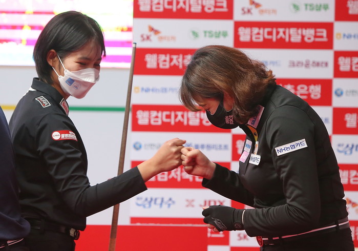 ▲ 나란히 32강에 진출하는 스롱피아비(왼쪽 세계 2윌) 김민아(NH농협카드)가 주먹을 부딪치며 축하해주고 있다 |