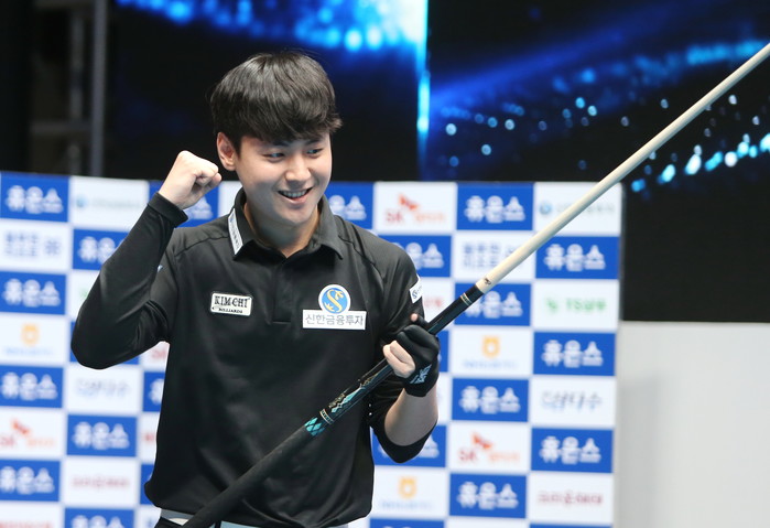 ▲세트스코어 3대1로 당구의 신 쿠드롱을 제치고 4강 진출한 신정주가 주먹을 불끈쥐며 환호하고 있다<김철호기자> |