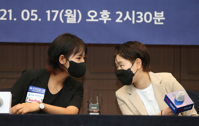 사진설명;블루원리조트에 지명된 스롱피아비와 휴언스에 지명된 김세연이 기자들의 질문에 답하고 있다