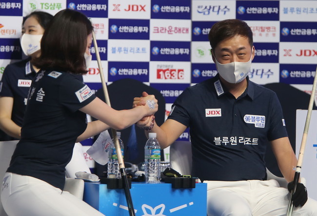 [브릴리언트 빌리아드=김철호 기자] 2020 신한금융투자 PBA TEAM LEAGUE 1라운드가 10일 고양시 소노캄 고양 그랜드 볼륨에서 무관중으로 랜선응원단을 배경으로 전원 마스크 착용으로 열렸다. 국내처음이자 세계 처음으로 열리는 팀 리그경기는 10일부터 나흘간 6라운드를 펼쳐 순위를 가리는 방식으로 진행된다. 리그 상위 3개 팀은 내년에 열리는 플레이오프에 진출하며 원년 참피온은 1억원의 상금을 받게 된다.