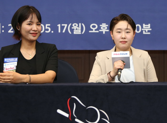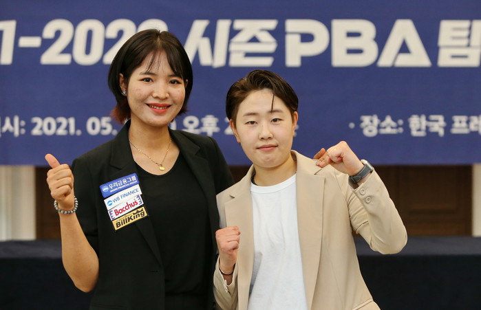 <PBA 팀리그 NEWS>17일 오수 2시30분 중구 프레스센타 프레스클럽에서 진행된 20-2021 PBA 팀리그 드래프트 행사에서 새로운 8번째 팀에 지명된 김세연선수와 블루원리조트 블루원엔젤스에 지명된 스롱피아비가 우승을 향해 선전할 것을 다짐하며 포즈를 취했다.<사진=김철호기자>