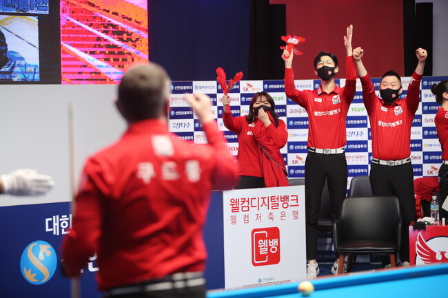 [브릴리언트 빌리아드=김철호 기자] 22일 고양 빛마루 방송센타에서 열린 PBA 파이널 5차전. TS.JDX 히어로즈 와 웰컴저축은행 웰빙피닉의 세번째 남자 단식경기에서 TS.JDX히어로즈의 깁병호선수가 앞서나가다 14점 매치포인트에서 웰컴저축은행 웰빙피닉스의 쿠드롱에게 덜미를 잡혀 패배하고 말았다.