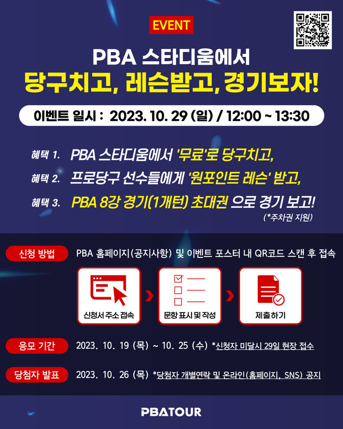 참가자격을 얻은 참가자들은 프로당구 선수들이 직접 경기하는 PBA 전용구장 ‘킨텍스 PBA 스타디움’ 내 경기장에서 약 40분간 4인1조로 경기를 할 수 있는 특별한 경험을 할 수 있다. 이후에는 PBA-LPBA 선수들이 직접 나서서 알려주는 ‘원포인트 레슨’이 진행될 예정이며, 사진 촬영과 팬사인회도 마련될 예정이다.